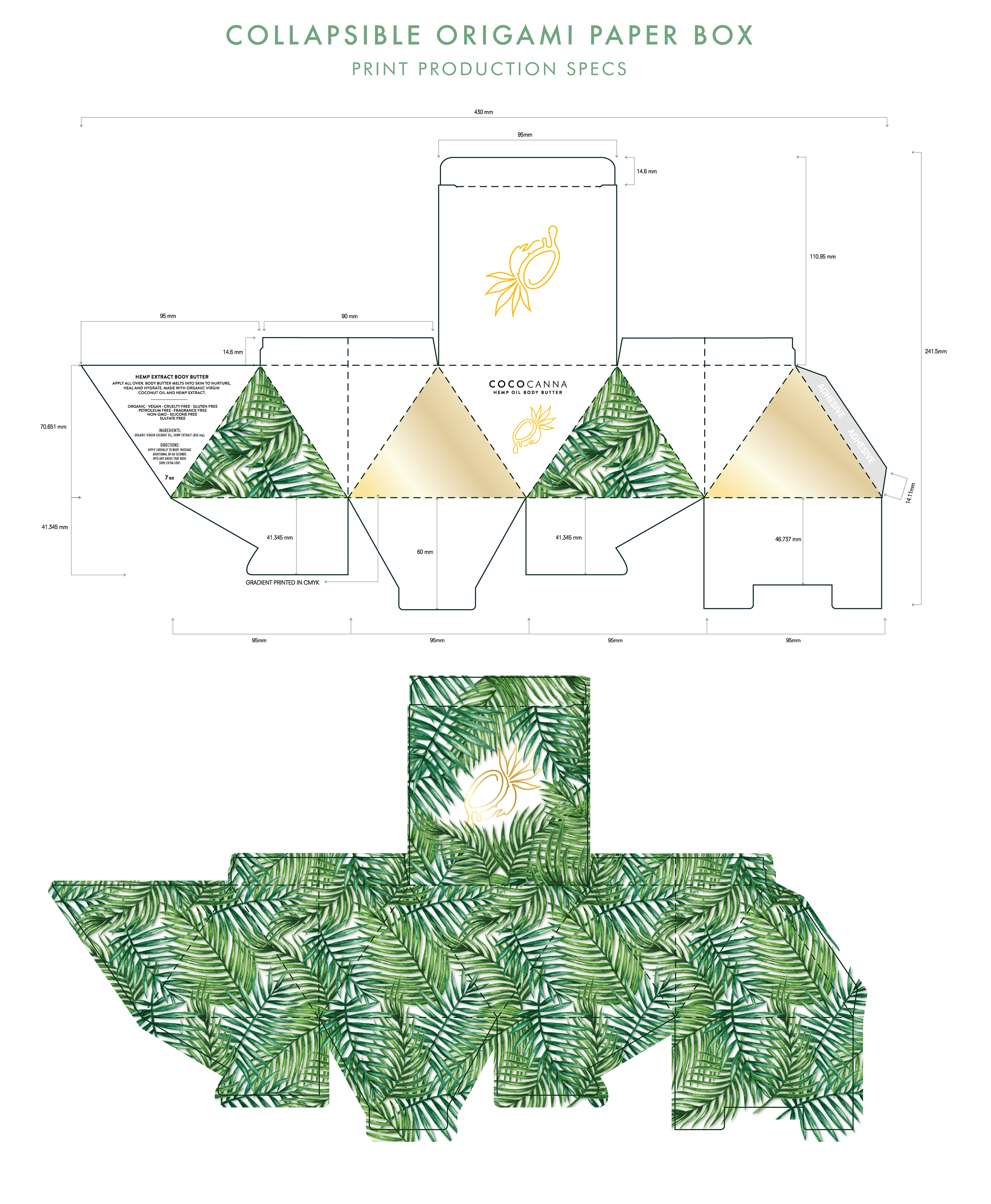 The design approach centered on creating a balance between luxury, nature, and sustainability to reflect the brand’s values. A significant focus was placed on research, including analyzing competitors, trends in eco-conscious packaging, and high-end skincare aesthetics. I sought to merge form and function by designing an origami-inspired, collapsible box for the flagship product, the Hemp Body Butter. This structure not only stands out visually with its alternating triangles but also fulfills the client’s need for collapsible packaging to reduce storage space, optimize shipping efficiency, and minimize environmental impact.